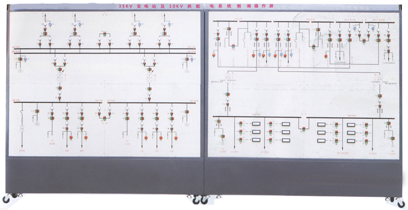 “ 35kV變電站及10kV供配電系統(tǒng)倒閘操作屏”是針對(duì)變電站倒閘操作而專門研制的實(shí)訓(xùn)裝置。本系統(tǒng)含35kV、10kV和0.4kV三個(gè)電壓等級(jí):35kV具有4路進(jìn)線,雙母帶聯(lián)絡(luò);10kV側(cè)采用單母分段,兩入兩出,環(huán)網(wǎng)供電;0.4kV側(cè)采用單母分段,并具有備用發(fā)電系統(tǒng)。在此典型35kV變電站模型上,學(xué)生可以進(jìn)行各種工況下的倒閘操作。變電站的電壓等級(jí)和結(jié)線方式也可以根據(jù)用戶要求設(shè)計(jì)。因此本裝置適合各類職業(yè)院校供配電類、電力公司、職業(yè)技能培訓(xùn)部門等機(jī)構(gòu)的培訓(xùn)、考核。
