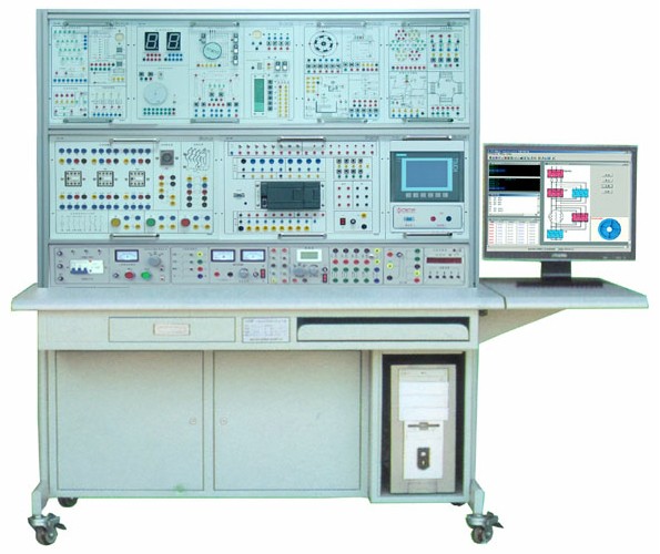 實訓裝置由控制屏、實訓桌、PLC主機實訓組件、實訓模擬對象掛箱(含豐富的工業(yè)現(xiàn)場設備模擬實訓對象)、變頻器掛箱、觸摸屏掛箱、交流電機、接觸器、按鈕、行程開關、工控組態(tài)軟件、仿真軟件、電機等組成。