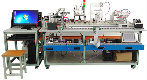 機(jī)電一體化綜合實訓(xùn)考核裝置是光機(jī)電氣一體化控制實訓(xùn)系統(tǒng)的核心組成部分。該裝置主要由鋁合金導(dǎo)軌式實訓(xùn)臺、典型的機(jī)電一體化設(shè)備機(jī)械部件、PLC模塊、變頻器模塊、按鈕模塊、電源模塊、模擬生產(chǎn)設(shè)備實訓(xùn)模塊、接線端子排和各種傳感器、計算機(jī)等關(guān)鍵部件組成。