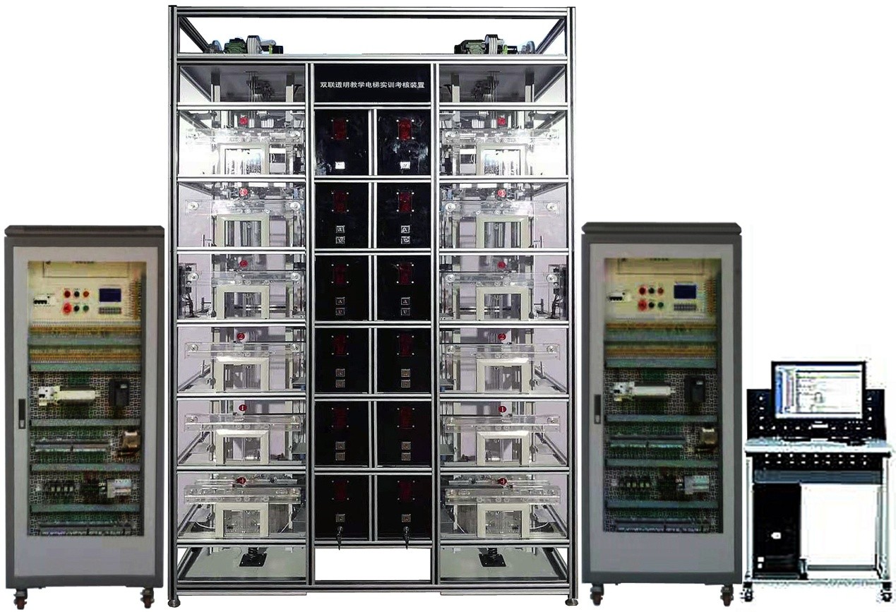 電梯控制技術(shù)綜合實(shí)訓(xùn)裝置是專門為職業(yè)院校開設(shè)的電氣自動(dòng)化、機(jī)電一體化、機(jī)械制造與自動(dòng)化等相關(guān)專業(yè)而研制的,裝置根據(jù)智能建筑中升降電梯的機(jī)構(gòu)按照一定的比例縮小設(shè)計(jì),所用設(shè)備、器件與實(shí)際電梯基本一致,采用槽鋼方管框架結(jié)構(gòu)整體設(shè)計(jì),正面使用透明有機(jī)玻璃面板,融低壓電氣、PLC、變頻調(diào)速、智能人機(jī)、傳感檢測(cè)、視頻監(jiān)控、智能考核系統(tǒng)等于一體,實(shí)現(xiàn)智能電梯復(fù)雜的開關(guān)量控制、時(shí)序邏輯控制。通過該裝置的操作訓(xùn)練可考核學(xué)生掌握智能電梯的裝調(diào)與維護(hù)綜合能力,如電梯呼梯盒的安裝、井道信息系統(tǒng)的安裝、平層開關(guān)檢測(cè)位置調(diào)整、門機(jī)機(jī)構(gòu)調(diào)整、電氣控制柜的器件安裝、接線、變頻器參數(shù)設(shè)置、PLC編程與調(diào)試、電梯群控功能調(diào)試、電梯故障排除、運(yùn)行維護(hù)等,除了滿足專業(yè)實(shí)訓(xùn)教學(xué),還能開展技能考核以及職業(yè)技能競(jìng)賽。