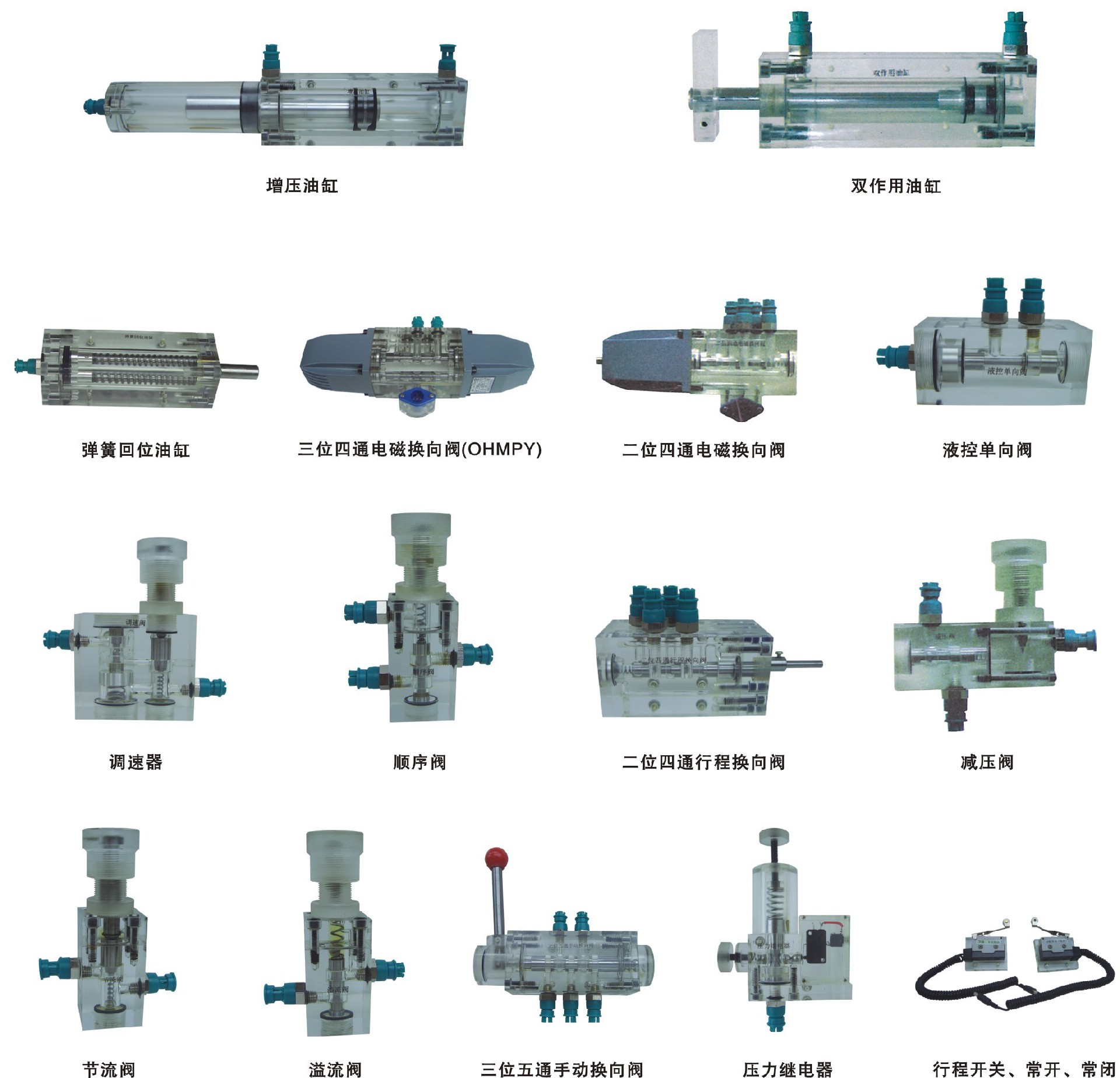 4、實(shí)訓(xùn)元件均為透明有機(jī)材料制成,便于了解掌握幾十種常用液壓元件的結(jié)構(gòu),性能及用途。掌握幾十種基本回路的工作原理,實(shí)驗(yàn)組裝回路快捷、方便。