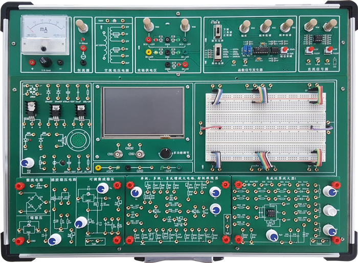 含機箱、工作電源、常用模擬信號源、實驗電路區(qū)和分立元件和測量儀器等