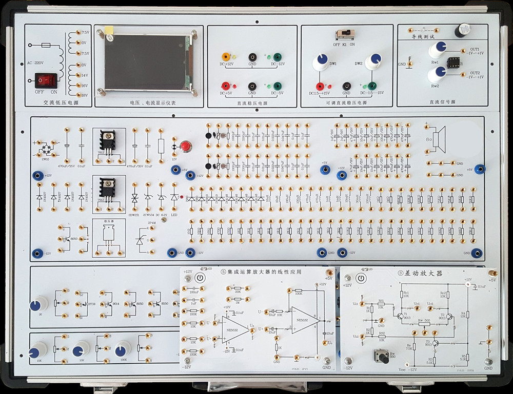 固定線路獨(dú)立模塊是實(shí)驗(yàn)箱的又一重要組成部分。這些模塊采用了獨(dú)特的設(shè)計(jì),如電源輸入設(shè)計(jì)在模塊的4角上,采用錯(cuò)位設(shè)計(jì)方式避免插反或插錯(cuò),以及使用觸摸開(kāi)關(guān)控制模塊電路上的電源等。模塊的種類豐富,包括晶體管共射放大器、場(chǎng)效應(yīng)管放大電路、差分放大電路、負(fù)反饋放大電路等,可以滿足各種實(shí)驗(yàn)需求。