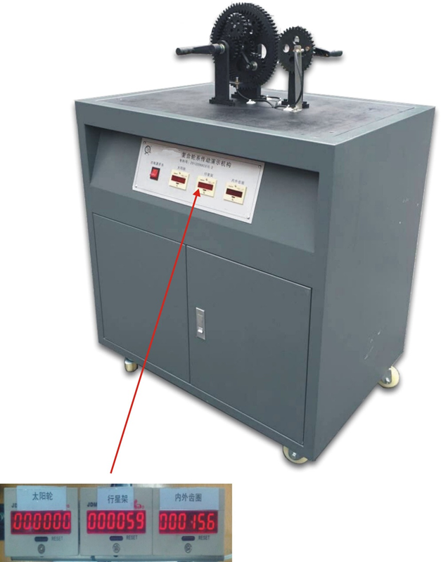 該復(fù)合輪系主要用于演示輪系的運(yùn)動(dòng)規(guī)律,觀察齒輪的運(yùn)動(dòng)方向和傳動(dòng)比,為便于直觀觀察輪系的輸入輸出傳動(dòng)比,在太陽(yáng)輪1、行星架H、齒圈3的特定位置裝有傳感器,通過計(jì)數(shù)器將輪系的輸入輸出轉(zhuǎn)過的圈數(shù)顯示出來。
