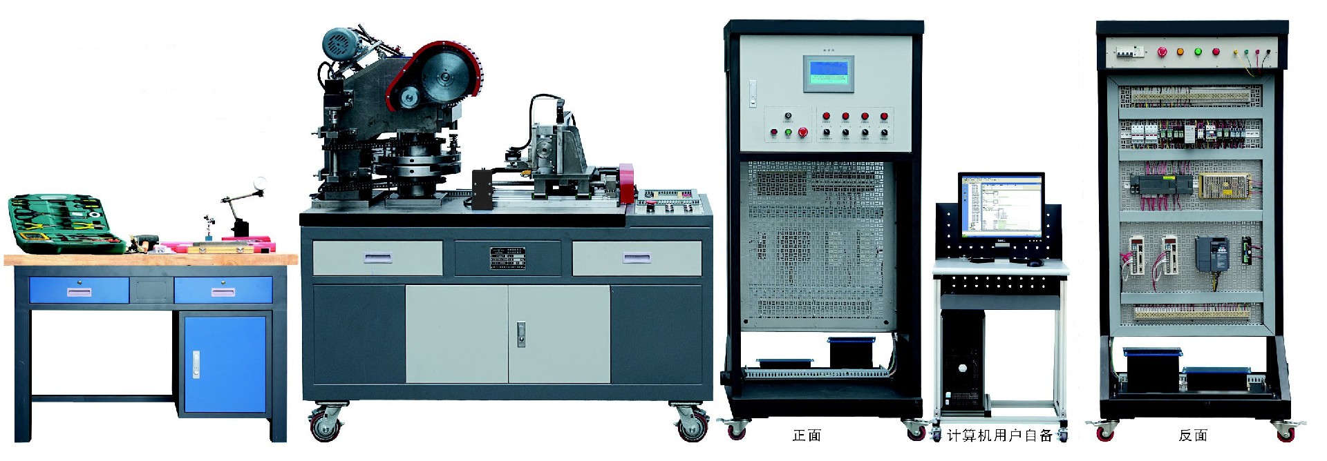 本實(shí)訓(xùn)裝置主要由實(shí)訓(xùn)臺(tái)、電氣控制柜(包括電源控制模塊、可編程控制器模塊、變頻器模塊、觸摸屏模塊、步進(jìn)電機(jī)驅(qū)動(dòng)模塊、伺服電機(jī)驅(qū)動(dòng)模塊等)、動(dòng)力源(包括三相交流電機(jī)、步進(jìn)電機(jī)、交流伺服電機(jī)等)、機(jī)械傳動(dòng)機(jī)構(gòu)、二維送料部件(十字滑臺(tái))、轉(zhuǎn)塔部件、模具、離合器機(jī)構(gòu)、機(jī)械式?jīng)_料機(jī)構(gòu)、裝調(diào)工具、常用量具、操作臺(tái)、型材電腦桌等組成。