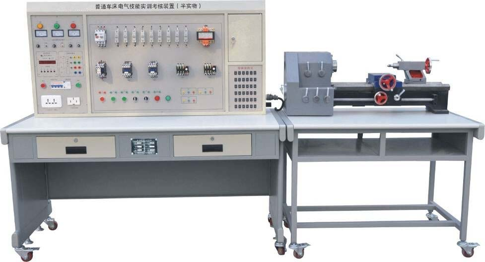 本裝置由電源控制部分、機(jī)床電氣控制部分、半仿真機(jī)床實(shí)物部分構(gòu)成。電源控制部分包括實(shí)訓(xùn)定時(shí)、定時(shí)報(bào)警、安全用電自動(dòng)控制等,機(jī)床電氣控制部分把整臺(tái)機(jī)床內(nèi)部電器裝在正面面板上,能直觀地觀察機(jī)床工作時(shí)各電器的動(dòng)作狀況。故障點(diǎn)在面板上設(shè)有相應(yīng)測試點(diǎn),供實(shí)訓(xùn)考核者測試用。仿真機(jī)床部分能模擬機(jī)床各種運(yùn)動(dòng)。通過本裝置的實(shí)訓(xùn)能使學(xué)員掌握機(jī)床常見故障的現(xiàn)象、故障產(chǎn)生的大概部位,熟練掌握機(jī)床電路工作原理,其是維修電工初、中、高級(jí)技能鑒定的理想設(shè)備。