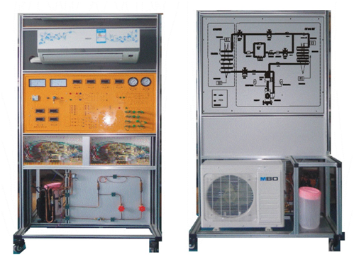 4.空調(diào)整機單元1套:包括熱泵型分體空調(diào)所必需的一些部件,如蒸發(fā)器、冷凝器、壓縮機、四通閥等,管路中還設(shè)有控制閥等實訓所必需的部件