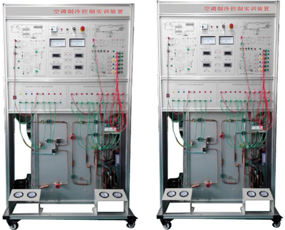 裝置配置了2套系統(tǒng),空調(diào)系統(tǒng)1套、直冷式電冰箱綜合系統(tǒng)1套可同時(shí)滿足對空調(diào)、冰箱實(shí)訓(xùn)操作考核的要求