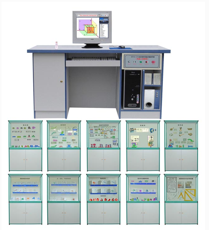 本套陳列柜采用121件動(dòng)畫圖象配合陳列柜上的內(nèi)容在電腦上演示各種模型特點(diǎn),如制圖工具的使用、投影產(chǎn)生過程、投影作圖步驟、裝配功能等、生動(dòng)形象。