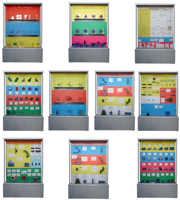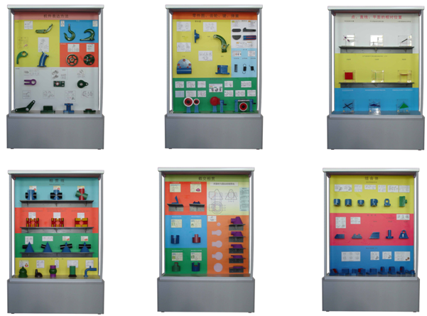 《機械制圖》陳列柜是根據(jù)大、中專院校、技校、職業(yè)學校的教材而設置的教學實驗室設備,目的是使學生加強對《機械制圖》的認識。本陳列柜主要包括零件的標準要素,常用標準件和標準部件及其標準數(shù)據(jù),作圖方法和步驟以及圖樣等進行陳列,對機械專業(yè)的學生的理論學習,使用范圍等增強認識、加深理解,是機械專業(yè)學校提高教學質(zhì)量的理想教具設備。本陳列柜共分16個柜,每個柜有每個柜的特點。