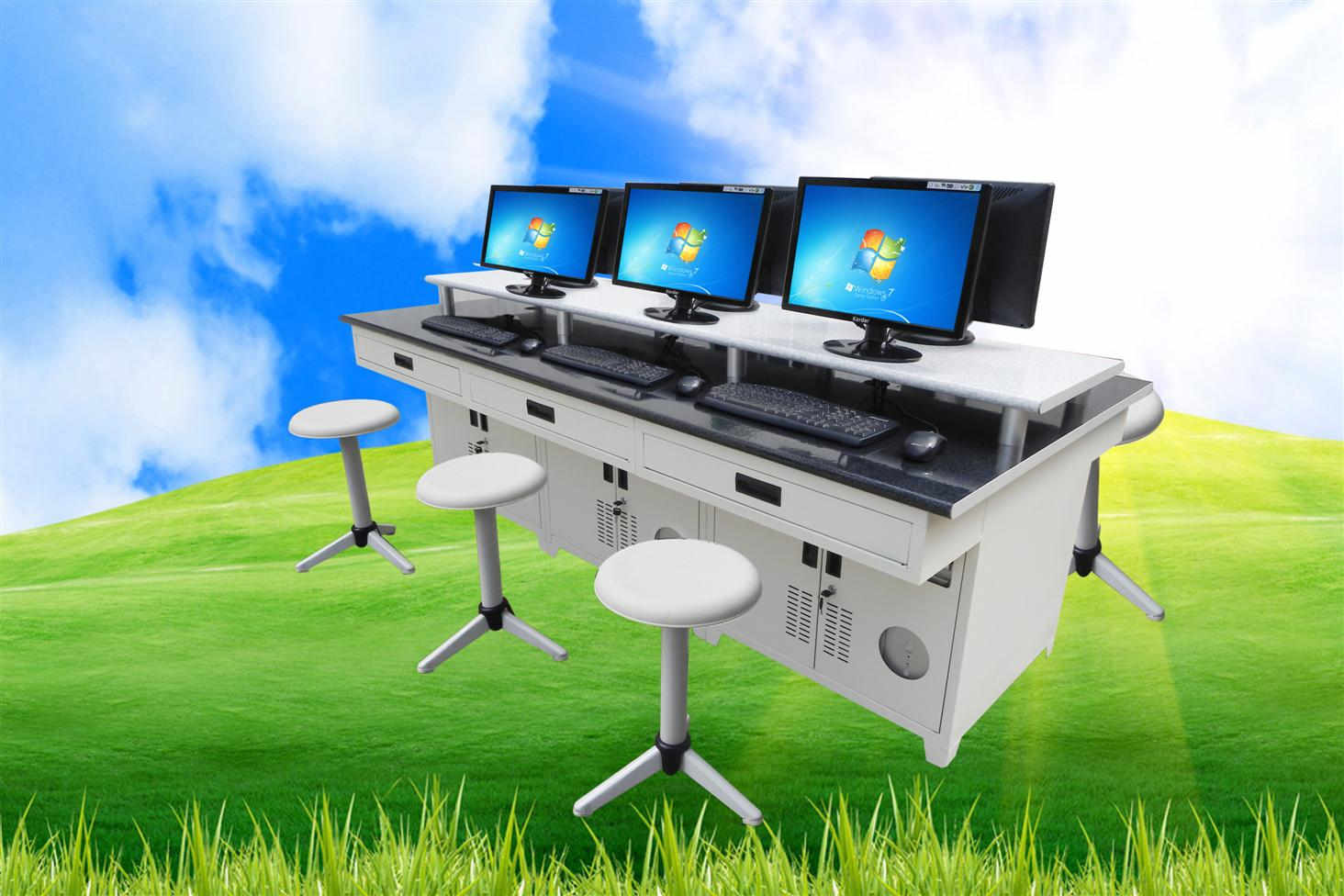 1 | 雙面板6人座電算化手工綜合學生桌(全鋼結構25mm防火板圓邊成型桌面) | 2180×1100×810(6人/張)材料選用精裝冷軋鋼板、采用先進工藝一次折彎組焊成型,邊角園弧過度。縫隙結合均勻,具有散熱、隔音、安全防盜、防蛀、防鼠、防塵、防水等優(yōu)點。表面經(jīng)酸洗、磷化、防腐、防銹處理后采用靜電橘皮面噴塑,面板采用25mm厚雙貼面耐磨、耐高溫、易清潔、防水、防潮半圓后成型鏡面防火板,三節(jié)鋼珠消音導軌輕便耐用,每個機箱位和抽屜裝有隱藏式拉手、前門采用上下互鎖機構加強了防盜性,操作輕巧便捷??煞胖秒娔X主機、15~19寸顯示器、鍵盤、鼠標等教學設備。造型設計以人為本,整體美觀大方,結實耐用。 | 10張 |