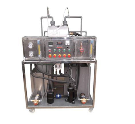 全封閉制冷壓縮機、冷凝器、節(jié)流閥、蒸發(fā)器、冷水泵、熱水泵、玻璃轉(zhuǎn)子流量計,水箱、電加熱裝置、液體轉(zhuǎn)子流量計、8路萬能巡檢儀、溫度傳感器、高低壓控制器、干燥過濾器、儲液罐、電流表、電壓表、壓力表、不銹鋼移動式實驗臺等組成。