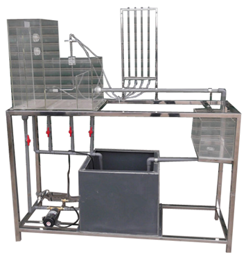 水泵、蓄水箱、畢托管、測壓計、管嘴射流裝置、恒壓水箱、計量水箱、刻度標尺、秒表、自循環(huán)系統(tǒng)、不銹鋼框架。