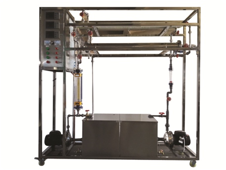 主要設(shè)備 | 普通換熱器:直徑Φ25mm,管長(zhǎng)1200mm。 列管換熱器:直徑Φ45mm,管長(zhǎng)1200mm。 熱水泵:功率370W,最大流量3m3/h。 冷水泵:功率370W,最大流量3m3/h。 冷、熱水流量:玻璃轉(zhuǎn)子流量計(jì)160-1600L/h。 加熱水箱:304不銹鋼材質(zhì),容積80L,帶貯水排空底閥,配有液位顯示裝置,內(nèi)置不銹鋼加熱器:加熱功率5.0KW。 冷水箱:304不銹鋼材質(zhì),容積80L,帶貯水排空底閥,配有液位顯示裝置;并配有冷水箱入口浮球閥,以保證水箱水位恒定。 熱流體進(jìn)出管:304不銹鋼材質(zhì),DN15,帶保溫層。 宇電AI704M多路數(shù)字溫度顯示儀。 宇電AI702M多路數(shù)字溫度顯示儀。 宇電AI518溫度控制儀(帶手動(dòng)功能)。 K型熱電偶溫度傳感器7支。 正泰電器:接觸器、開關(guān)、漏電保護(hù)空氣開關(guān)。 304不銹鋼水箱、不銹鋼管路、管件及閥門。 304不銹鋼儀表柜:測(cè)控、電器設(shè)備在實(shí)驗(yàn)架上。 304不銹鋼材質(zhì)框架1800*500*1800mm(長(zhǎng)×寬×高),帶腳輪及禁錮腳。 | |||