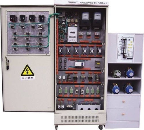 該裝置按標(biāo)準(zhǔn)電氣控制柜設(shè)計制造規(guī)格,充分利用雙面位置,柜內(nèi)裝有完成各種照明電路所需的單相電度表、日光燈、單聯(lián)開關(guān)、插座、感應(yīng)開關(guān)、漏電開關(guān)等,以及電氣控制所需要的多種低壓電器,如漏電斷路器、熔斷器、電流互感器、交流接觸器、時間繼電器、熱繼電器、中間繼電器、行程開關(guān)、按鈕、信號燈、轉(zhuǎn)換開關(guān)、電壓表、電流表、功率表及電度表等,為了延長電器使用壽命,各電器的接點都與接線端子相連,再由接線端子與被控制電氣連接。